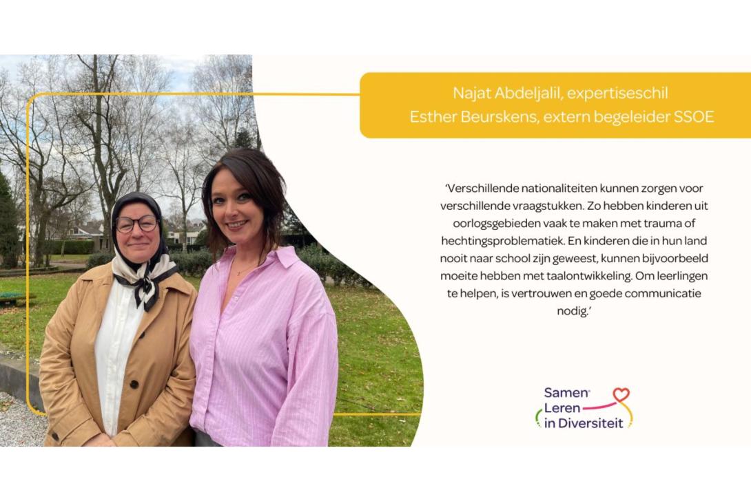 Als extern begeleider ondersteunt Esther onderwijsprofessionals bij hulpvragen die te maken hebben met het gedrag van kinderen. Daarbij gebruikt ze haar jarenlange ervaring als leerkracht in het speciaal onderwijs. ‘Het doel is meestal om veiligheid, rust, vertrouwen en verbinding terug te krijgen.’ Dat is soms lastig als het om een internationale leerling gaat, die de Nederlandse taal nog niet (voldoende) machtig is en die andere gewoonten kent. Dan werkt Esther samen met Samen Leren in Diversiteit, bijvoorbeeld met Najat Abdeljalil. Zij heeft jarenlange ervaring in schoolmaatschappelijk werk, kennis van cultuur- en traumasensitief werken én is meertalig. Najat: ‘Dat maakt dat ik de brug kan slaan tussen ouders, het kind en school.’